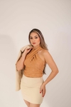 A blusa Sofhie com um drapeado elegante na frente e um decote halter, que é preso ao redor do pescoço, destacando os ombros e parte superior das costas. O material texturizado adiciona profundidade e interesse visual à peça, tornando-a única e estilosa. A combinação dessa blusa com uma saia justa de cor clara cria um contraste sofisticado e harmonioso, ideal para ocasiões em que você deseja um visual moderno e elegante.